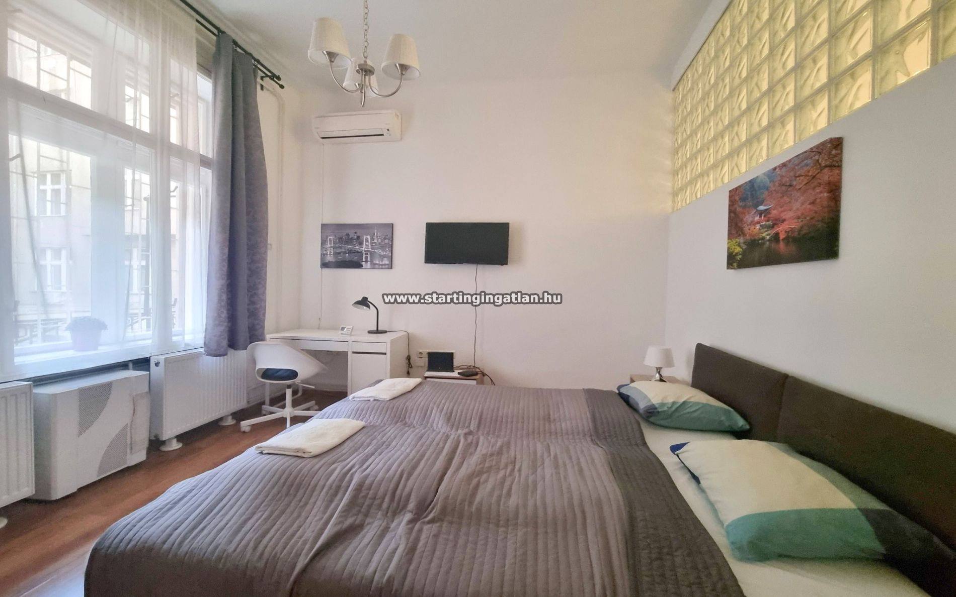 A lakás három különnyíló hálószobával, étkezővel és konyhával, két zuhanyzós fürdőszobával és két külön WC-vel rendelkezik, így akár 3 lakótársaknak is tökéletes választás. A hálószobák légkondicionáltak, ami a nyári időszakban is kellemes, pihentető környezetet biztosít. A lakás minimum egy évre bérelhető, havi bérleti díja 390 000 Ft, két havi kaució szükséges. A közös költség 33.400 Ft havonta, a rezsi fogyasztás alapján fizetendő, a fűtés cirkó rendszerrel működik.